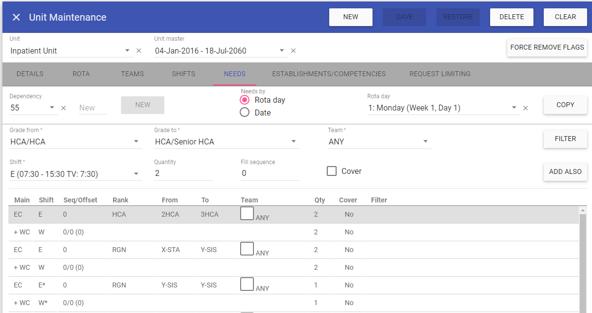 Rota day: Lists each individual day of the rota by week and day. Select the required week and day from the list against which the needs will be set. Whether you have a 7, 14 or 28 day rota, each day will need to be completed individually. If all the needs are the same, you can simply copy from one day to the other.