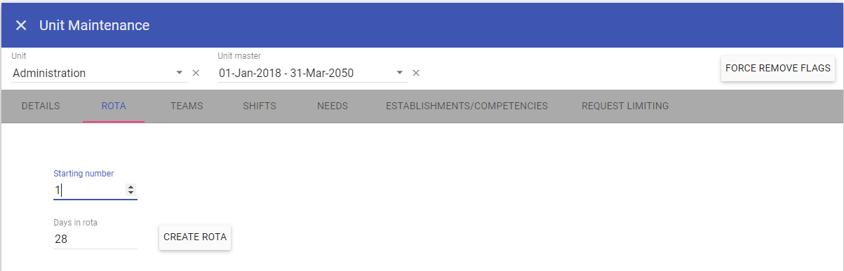 Start date: Enter a date when the unit master will start. This will need to be the same as the date of the first schedule required. Ensure that the date chosen reflects the normal starting day for a rota, if the unit schedules from a Monday ensure the date entered is a Monday.