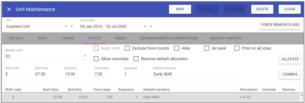 This screen allows you to configure Units created in Admin > Units. The configuration here filters through to the rotas.