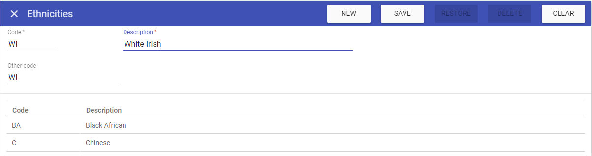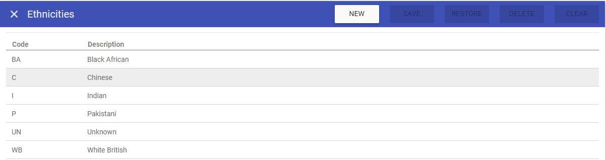 This screen allows you to create new ethnicities, as well as maintaining existing ethnicities that are stored on the system.