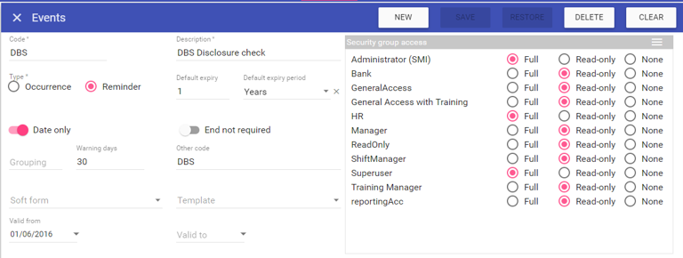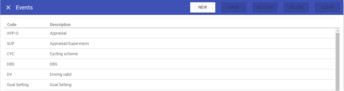 This screen allows you to create new events, as well as maintaining existing events that are stored on the system (an example of an event could be a disciplinary meeting).