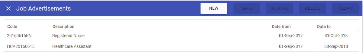This screen allows you to create new job adverts, as well as maintaining existing job adverts that are stored on the system.