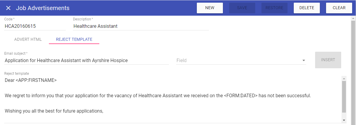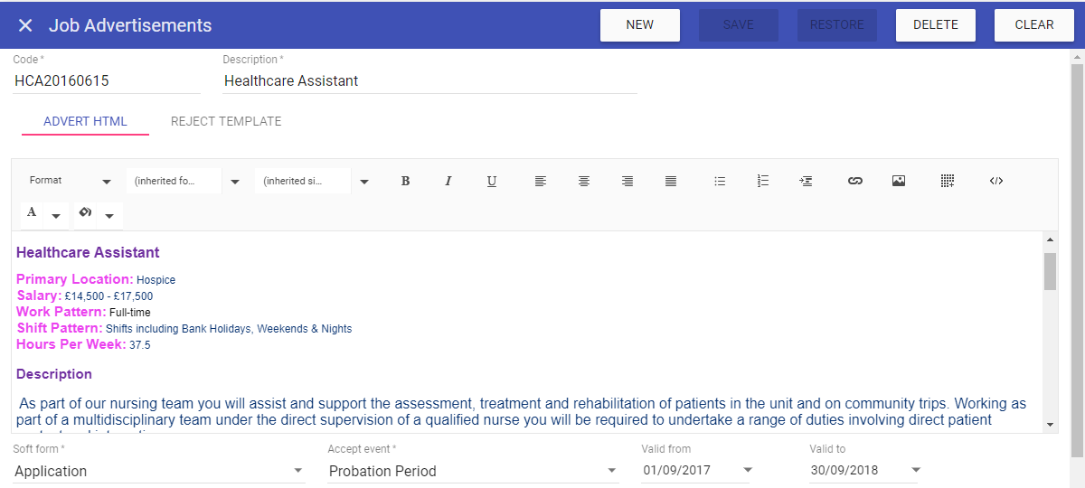 HTML editor: Create your advert here - the editor allows your plain text to be served as a HTML page automatically for applicant to view via the web.