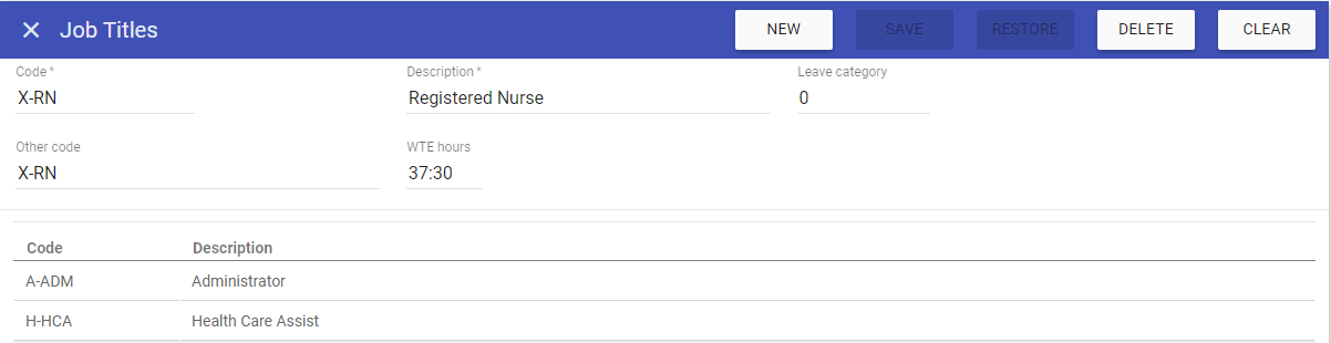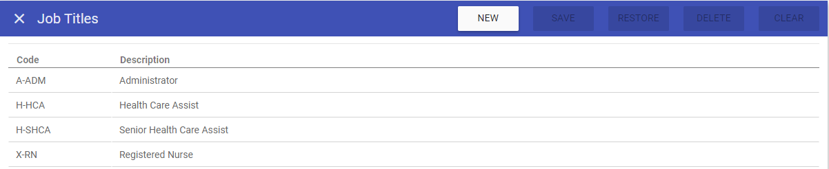 This screen allows you to create new job titles, as well as maintaining existing job titles that are stored on the system.