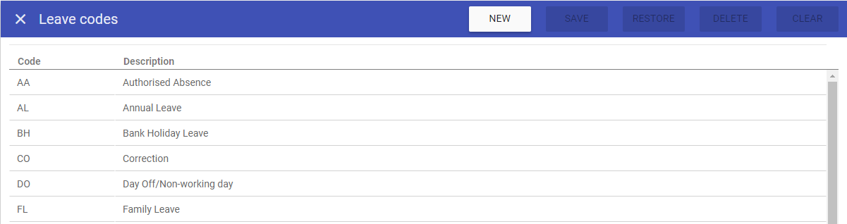 This screen allows you to create new leave codes, as well as maintaining existing leave codes that are stored on the system.