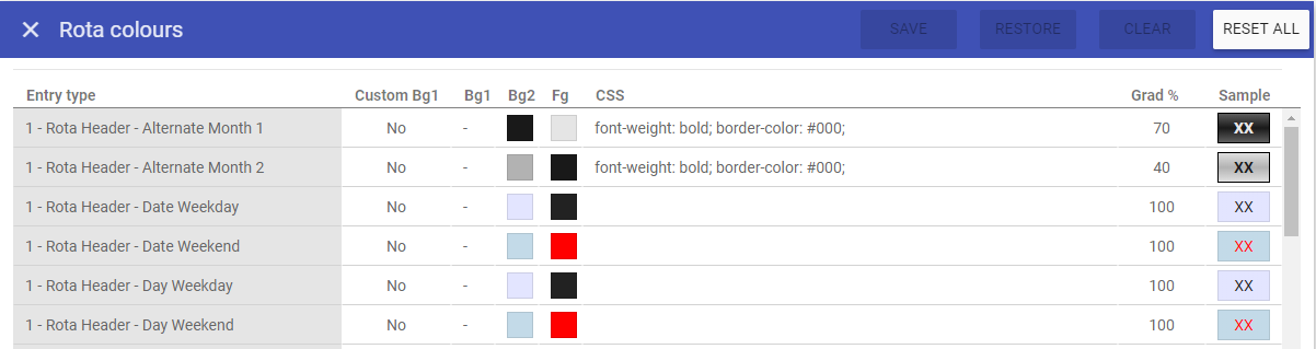 This screen allows you to create new rota colours, as well as maintaining existing rota colours that are stored on the system.