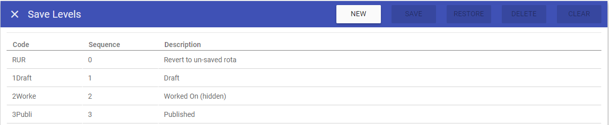 This screen allows you to create new save levels, as well as maintaining existing save levels that are stored on the system.