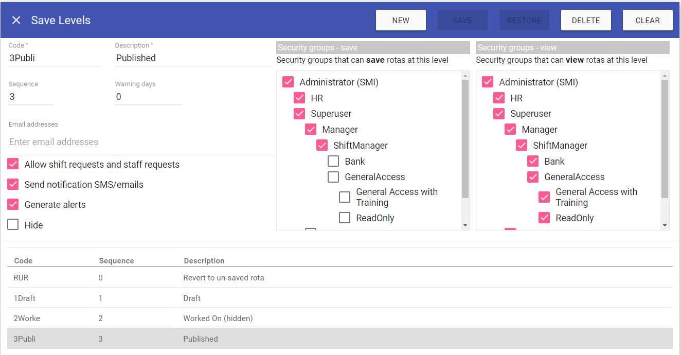 Generate Alerts: When selected, any changes made to rotas saved at this level, will send an alert to the affectede staff on Save.