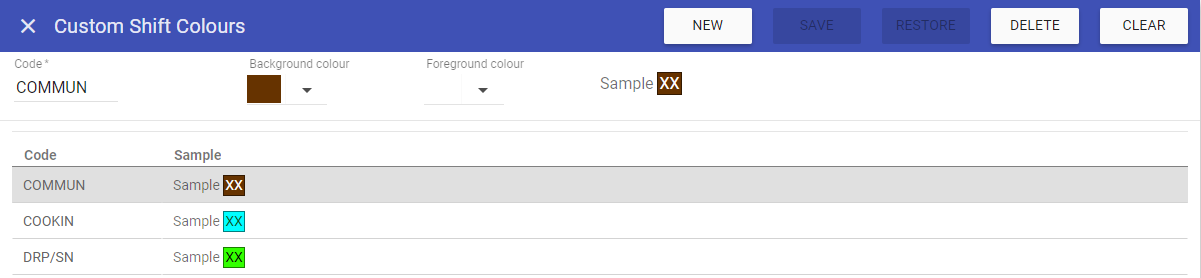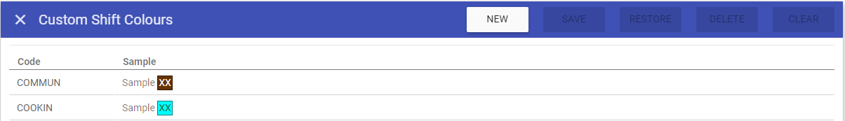 This screen allows you to create new shift colours, as well as maintaining existing shift colours that are stored on the system.