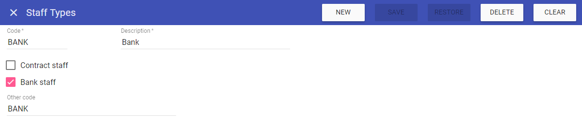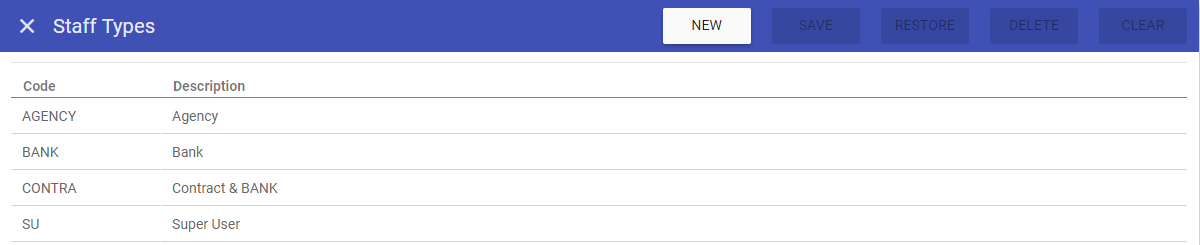 This screen allows you to create new Staff Types, as well as maintaining existing Staff Types that are stored on the system.