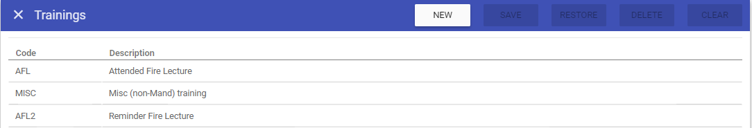 This screen allows you to create new Trainings, as well as maintaining existing Trainings that are stored on the system.