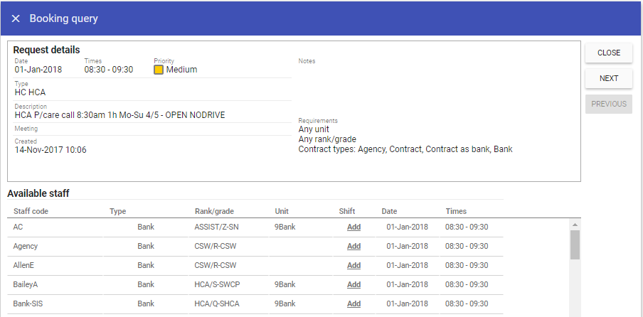 in-depth details of the request and also displays available staff to work the shift.