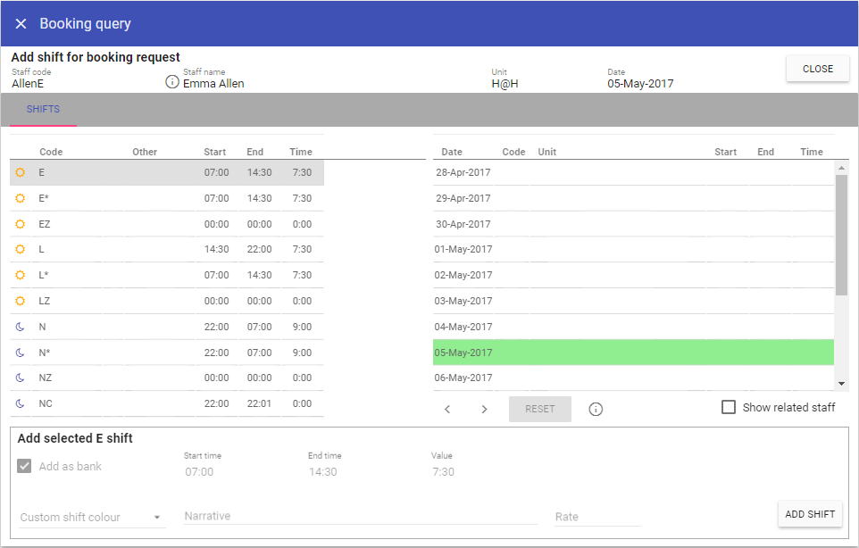 The E shift covers this job and therefore can be used. Click on the E shift to the left and then click Add shift at the bottom right to allow that staff member to work this shift to fill the request.