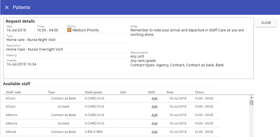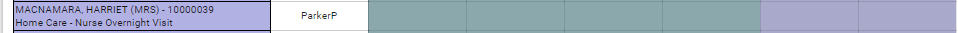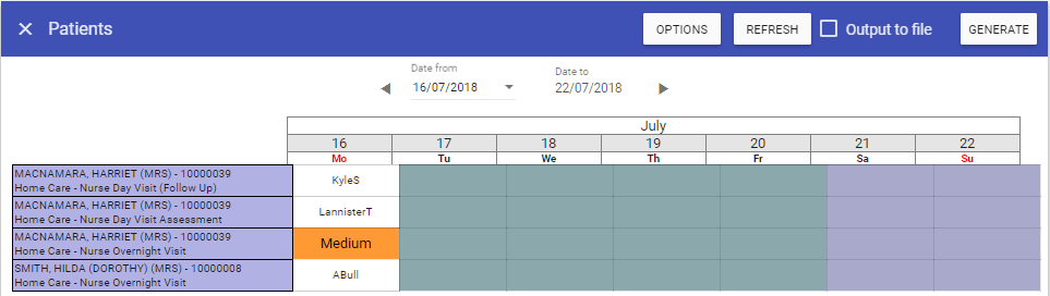 Patient names, and details of the visit are displayed on the panel to the left. The staff names that have filled the request are displayed on the schedule. Visits that have no staff members assigned are displayed showing its priority.