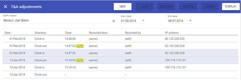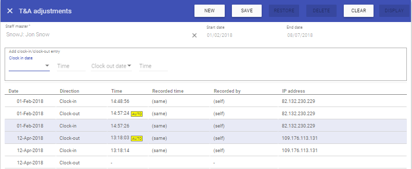 The T&A Adjustments sections allows for the editing of recorded Time and Attendance information should changes be required and creation of clock in’s and out’s.