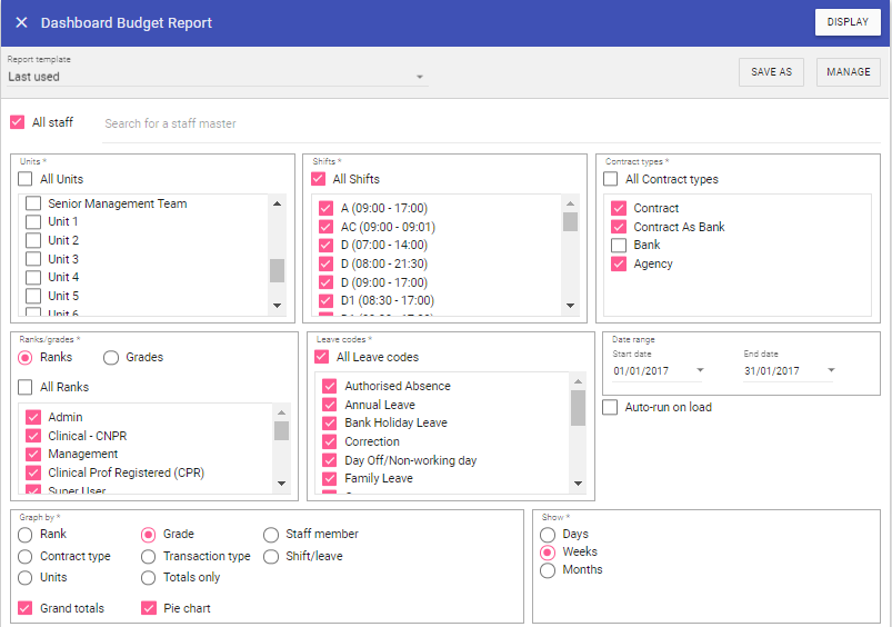 Transaction type: Will produce graphs by transaction type, Shift & Leave.