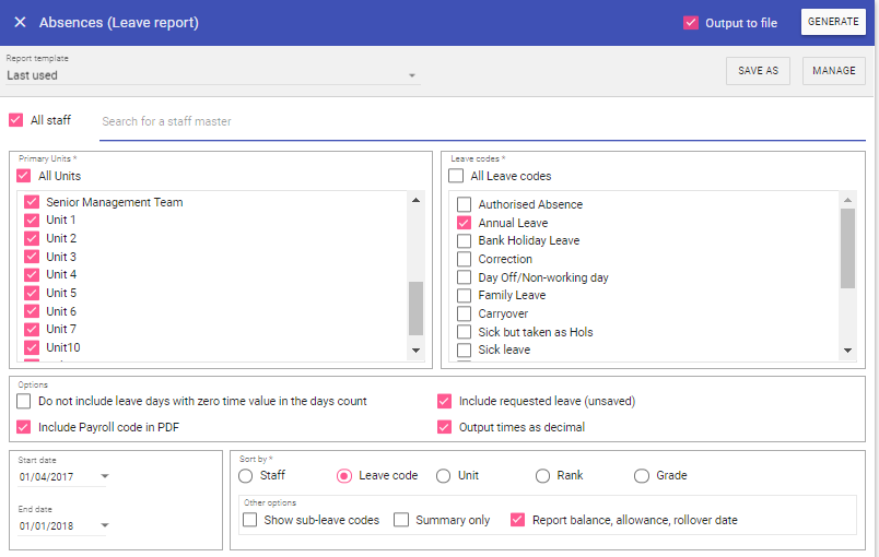Leave codes: As with primary units, if this is selected the report will not filter by Leave type (unless you sort by ‘Leave), however when unchecked individual leaves can be selected from the list allowing you to filter by the leave type.