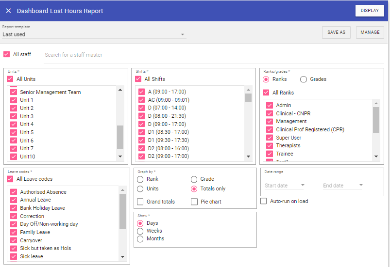 Leave Codes: As with primary units, if this is selected the report will not filter by Leave type (unless you sort by ‘Leave’), however when unchecked individual leaves can be selected from the list allowing you to filter by the leave type.