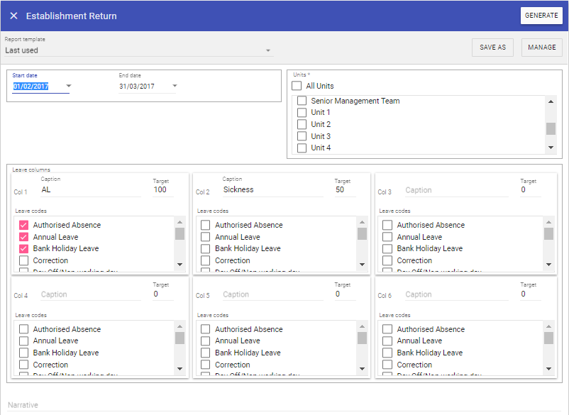 Establishments are used to specify the Whole Time Equivalent (WTE) Values for selected Ranks and Grades. Usage of this report is dependent on Establishment Values being entered in Unit Maintenance.