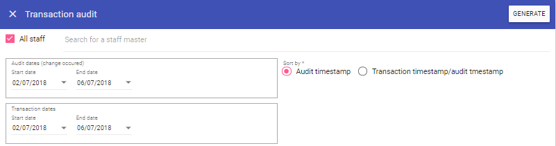 The transaction audit is similar to the view audit but it will report on all transactions assigned within a specific time period either by the Audit Date (date the transaction was saved/changed) or the transaction date (the date the transaction occurs).
