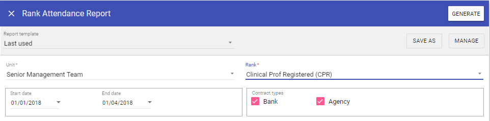 Rank Attendance produces a report based on the selected unit and rank for a given date range.