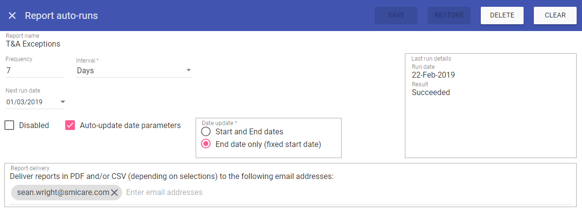 Start and End date: Start and end dates within the report template will be rolled forward inline with the set frequency of the auto-run.
