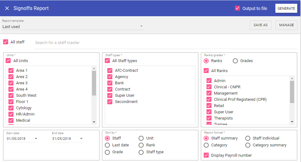 All Staff: Ticking the All staff box, runs the report on every staff member stored in Staff.Care that matches the report criteria.