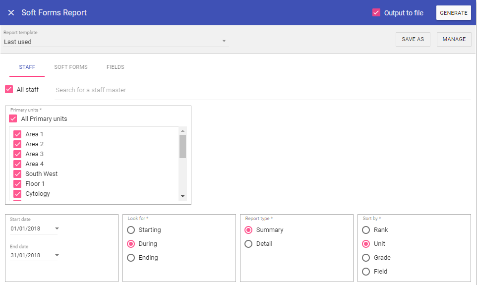 The Soft Form report produces a report based on all data from a Soft Form it differs from the Soft Form extract whereby it outputs the whole form rather than individual fields of the form.