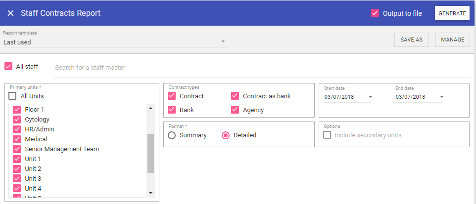 Primary Units: When selected the report will not filter by primary unit, however this can be unchecked and individual units selected from the list allowing you to filter by primary unit.