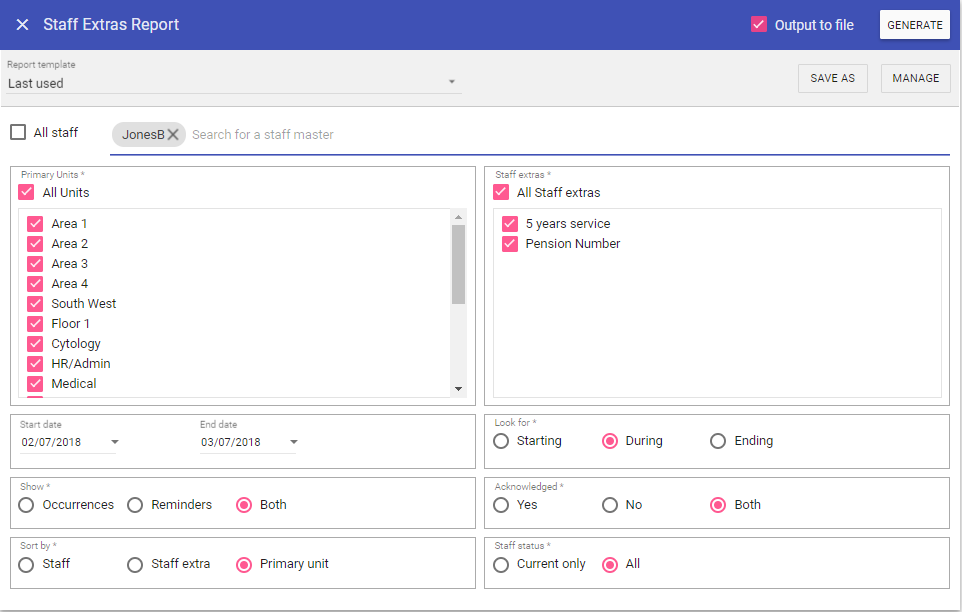 Staff extras: As with primary units, if this is selected the report will not filter by Extra type, however when unchecked individual Extras can be selected from the list allowing you to filter by the Extra type.