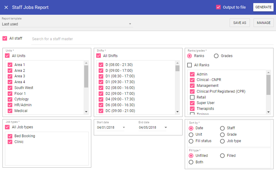 Shifts: When selected the report will not filter by Shift type (unless you sort by ‘Leave/shift’), however this can be unchecked and individual shifts selected from the list allowing you to filter by Shift type.