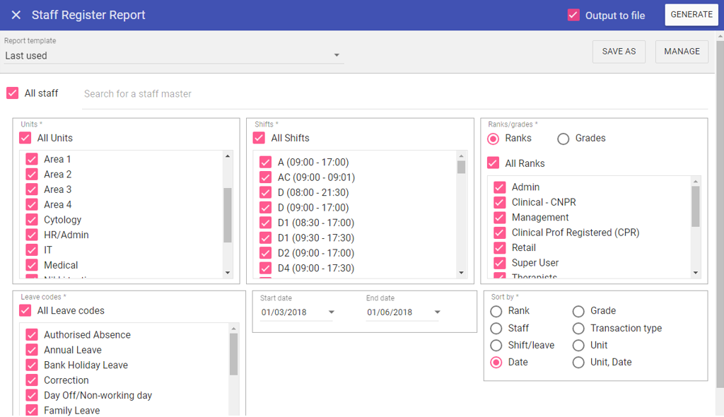 Shift/leave: Sorts staff members per shift/leave e.g. all staff members who worked an E Shift.
