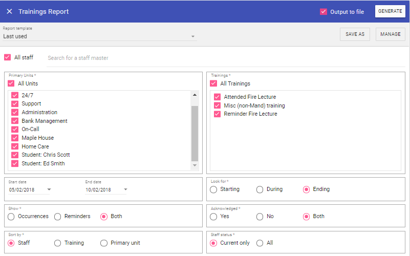 Trainings: As with primary units, if this is selected the report will not filter by Training type, however when unchecked individual trainings can be selected from the list allowing you to filter by the training type