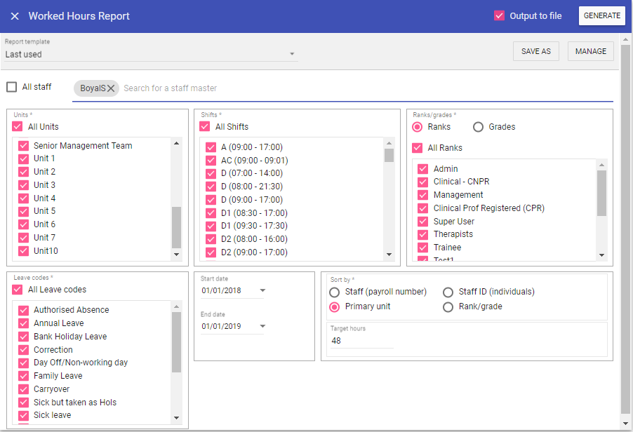 Shifts: When selected the report will not filter by Shift type (unless you sort by ‘Leave/shift’), however this can be unchecked and individual shifts selected from the list allowing you to filter by Shift type.