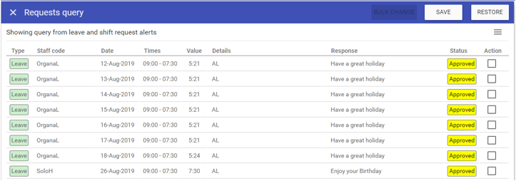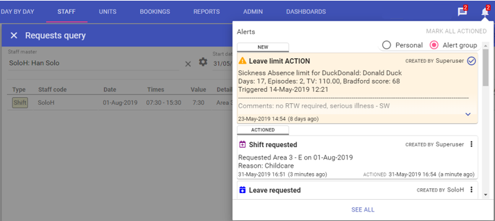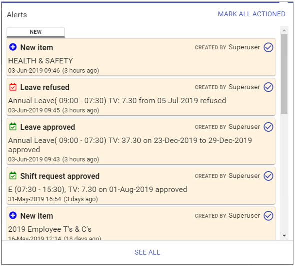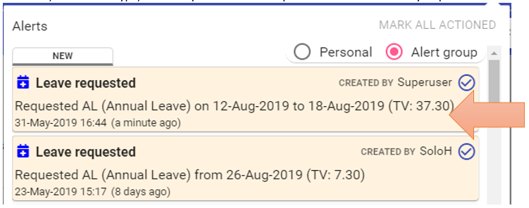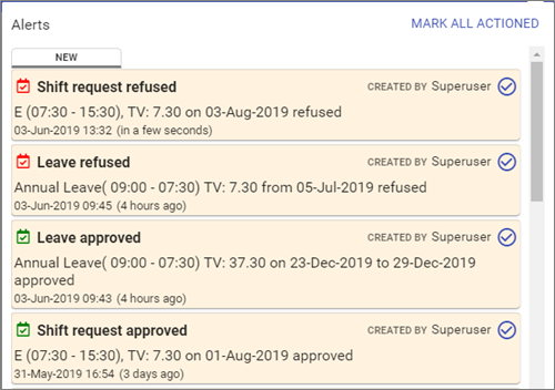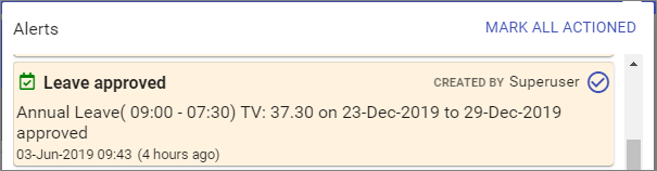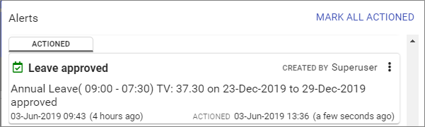 Once saved this will automatically mark any Alerts containing these leave requests as actioned and the staff member will receive an Alert stating their leave has been updated:
