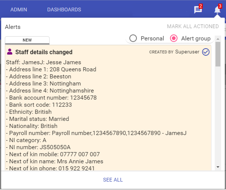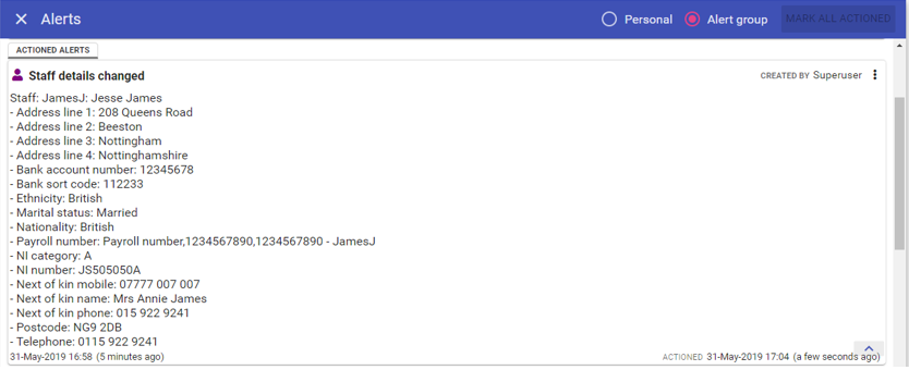 NOTE: Staff details changed Alerts are especially useful for Payroll and HR to keep tabs on Address, Bank details, contact information and Next of Kin.