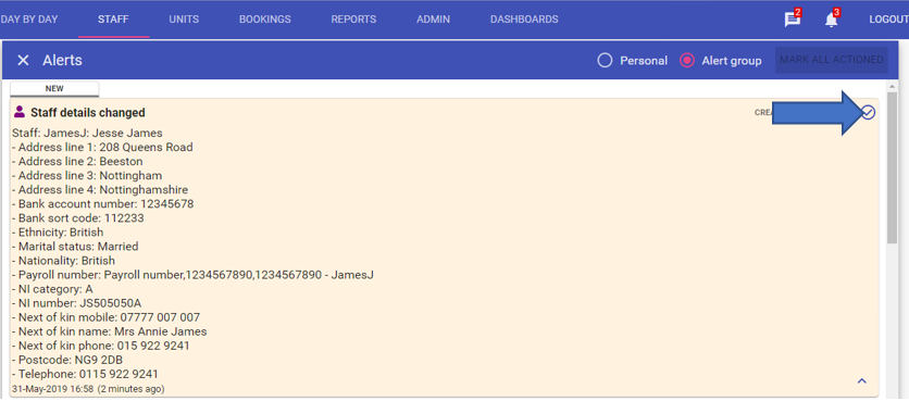 If any staff member you manage has any details changed on their staff record you will receive an Alert: