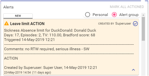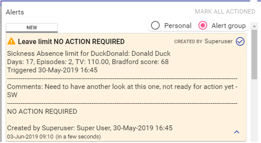 The leave limit Alerts are received when either someone marks a leave limit for action or un-actions a leave limit within the Dashboard. These are produced so any further action, such as a return to work