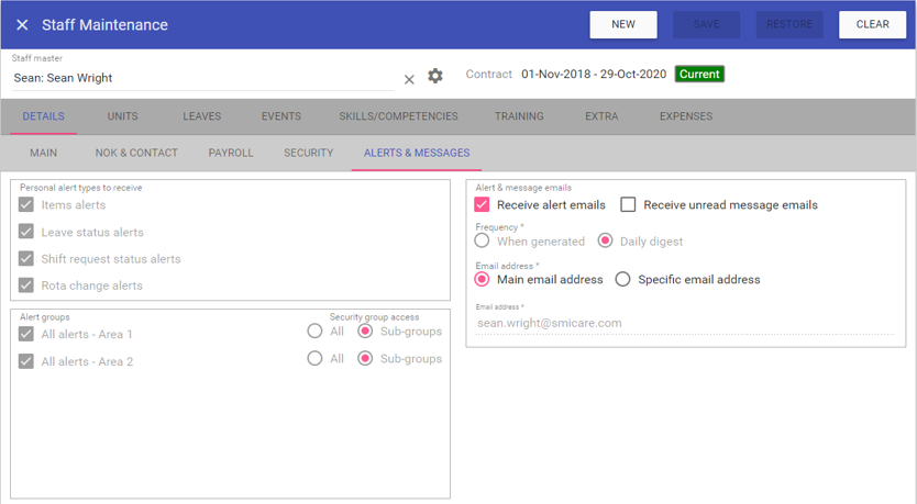 Managers can choose to have any Alerts and/or Messages you receive within Staff.Care to be emailed to you. Navigate to Staff > Staff Maintenance, select your record and click on ALERTS & MESSAGES: