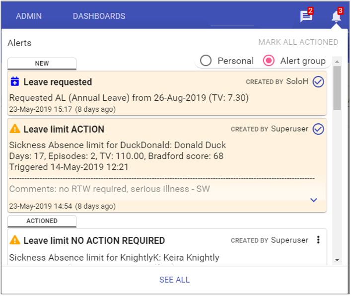 Personal - Shows your own Alerts (leave approval, new item added to your record etc).