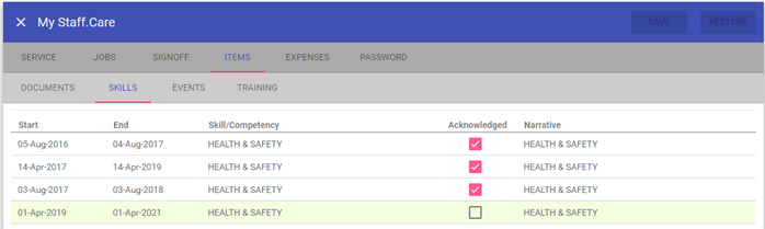 When a new Event, Skill, Training, Staff Extra or Document is added to your record, you will receive a new item Alert: