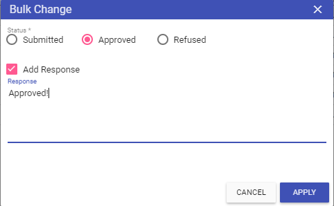 Action: Ticking this check box enables the Bulk Change button so that the status can be changed on multiple items to either submitted, refused or approved.