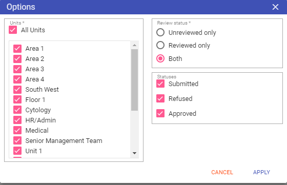 Units: Select the unit/s to be included in the report.