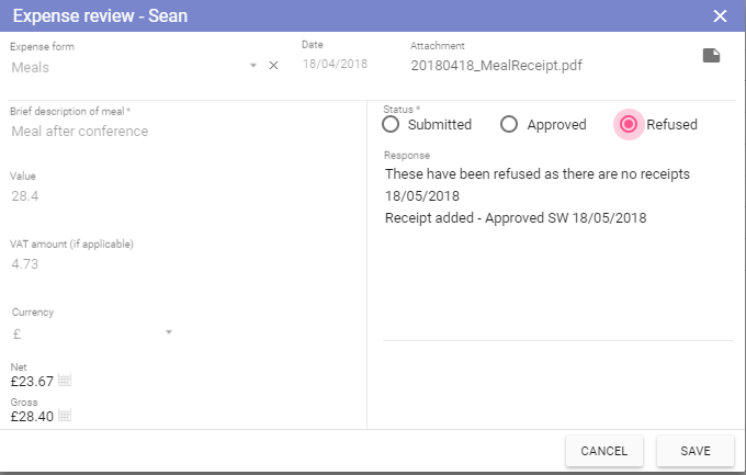 Refused: Selecting this sets the expenses item to the status of refused.