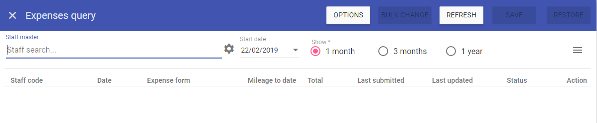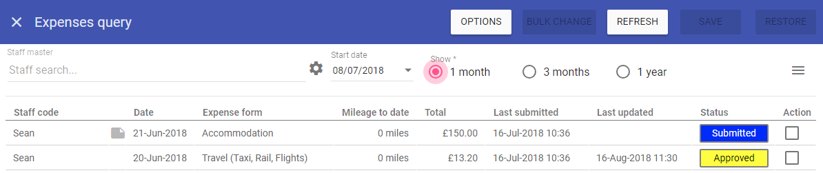 Expenses Query is for staff expenses and gives managers the facility to approve or refuse pending staff expenses that have been submitted.