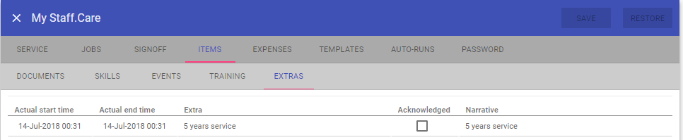 This screen allows you to view staff Extras that are created in Staff Maintenance > Extra. It is a viewer only however the the ability to Acknowledge Extras is possible via this screen.