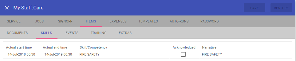 This screen allows you to view staff Skills that are created in Staff Maintenance > Skills. It is a viewer only however the the ability to Acknowledge skills is possible via this screen.