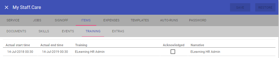 This screen allows you to view staff Trainings that are created in Staff Maintenance > Training. It is a viewer only however the the ability to Acknowledge Training is possible via this screen.