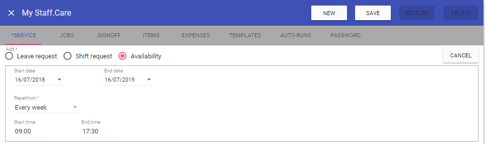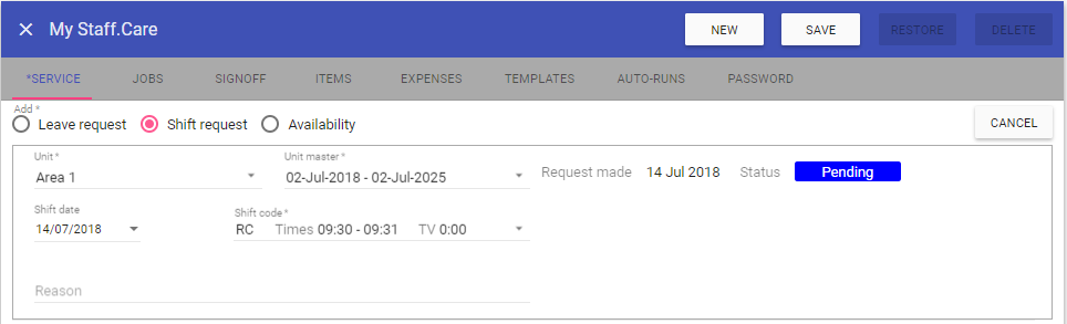 Request: When clicked, allows the staff member to book a Leave requirement, a shift requirement or Bank staff to select their Availability to work (subject to permissions). The types of requests are listed below. To create a new request, click New, complete the relevant fields and click Save.