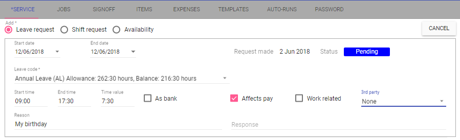 Response: Displays a text response when a leave request has been allowed/disallowed by an authorised user usually a manager.
